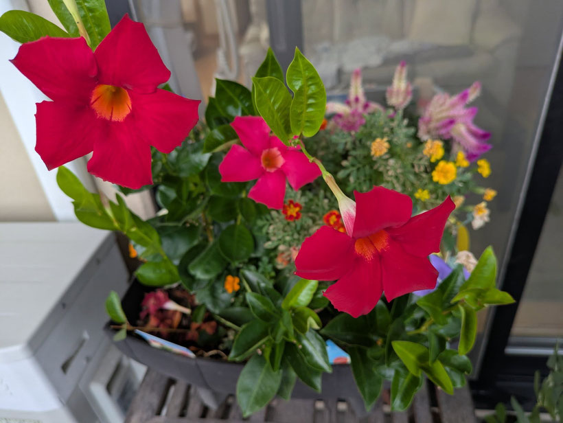 (自宅バルコニーのトロピカルな花は、「まだ夏だ」と言っていますよ・・・・)